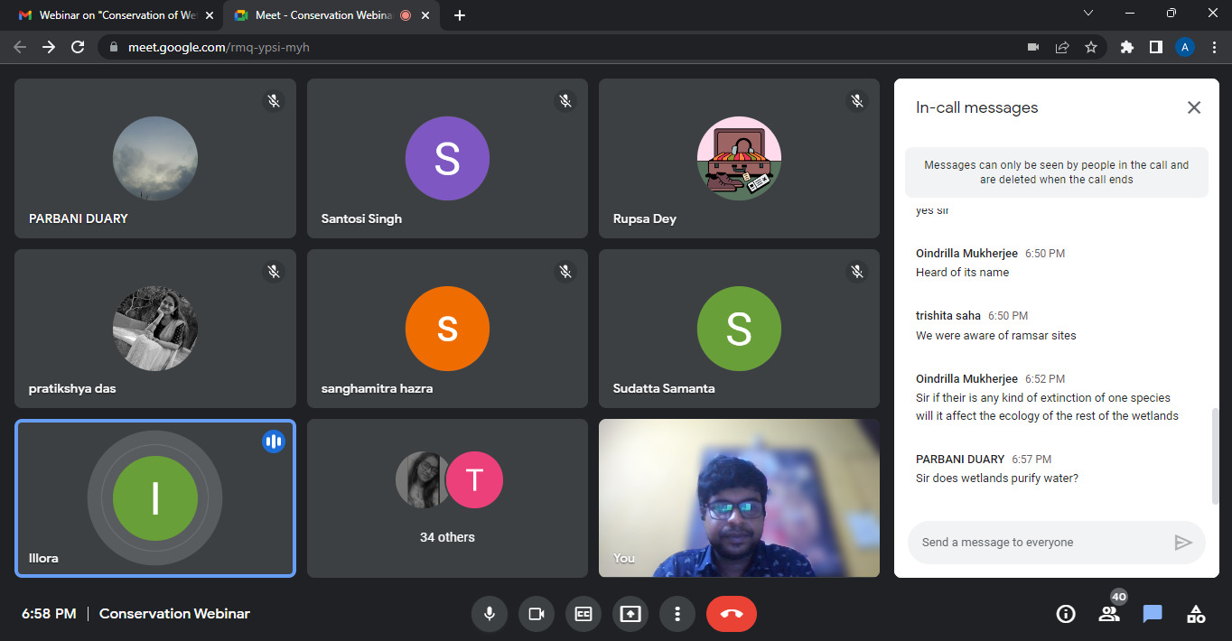 During the online session, Arghya Chakrabarty (Technical Officer – Biodiversity) Wetlands International South Asia, introduced the students to the concepts of wetlands mapping and delineation, Wetlands (Conservation & Management) Rules, 2017 and the purpose of designating a wetland as wetlands of international importance (Ramsar Site). He actively interacted with the students of all three semesters and spoke briefly about the significance of wetlands, types of wetlands, major threats to wetlands, and what an individual can do to preserve and protect wetlands. The session ended with a case study on the Sundarbans and East Kolkata Wetlands wherein the students directly interacted and exchanged important ideas.